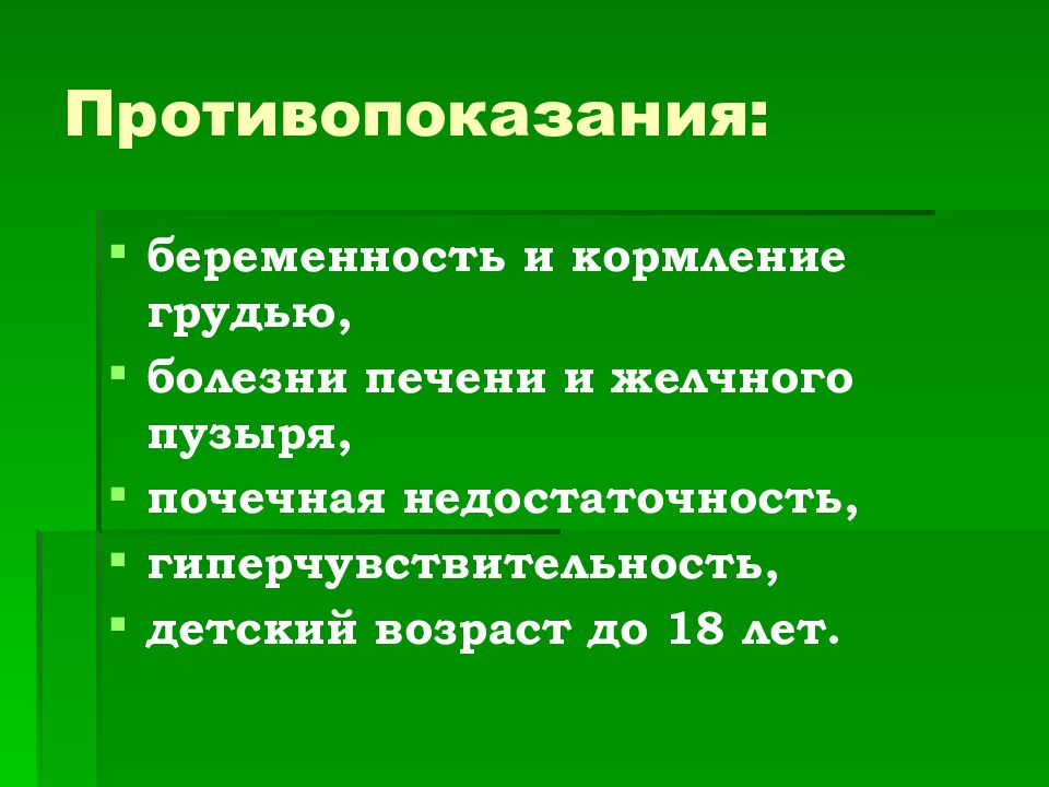 беременность и кормление грудью, болезни печени и желчного пузыря, почечная недостаточность, гиперчувствительность, детский возраст до 18 лет.