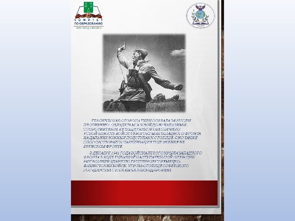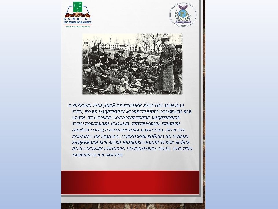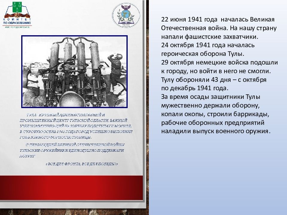 22 июня 1941 года началась Великая Отечественная война. На нашу страну напали фашистские захватчики. 24 октября 1941 года началась героическая оборона Тулы. 29 октября немецкие войска подошли к городу, но войти в него не смогли. Тулу обороняли 43 дня – с октября по декабрь 1941 года. За время осады защитники Тулы мужественно держали оборону, копали окопы, строили баррикады, рабочие оборонных предприятий наладили выпуск военного оружия.