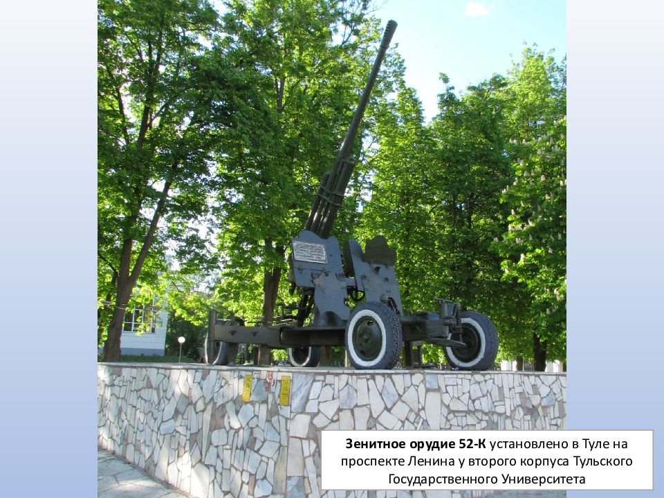 Зенитное орудие 52-К установлено в Туле на проспекте Ленина у второго корпуса Тульского Государственного Университета