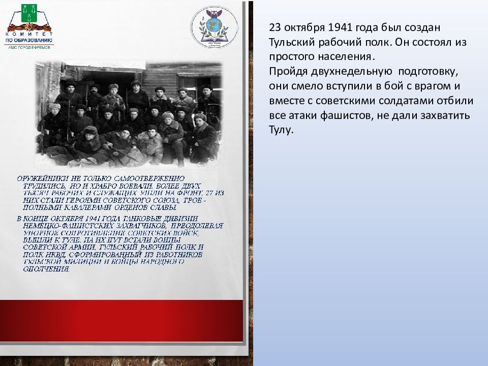 23 октября 1941 года был создан Тульский рабочий полк. Он состоял из простого населения. Пройдя двухнедельную подготовку, они смело вступили в бой с врагом и вместе с советскими солдатами отбили все атаки фашистов, не дали захватить Тулу.