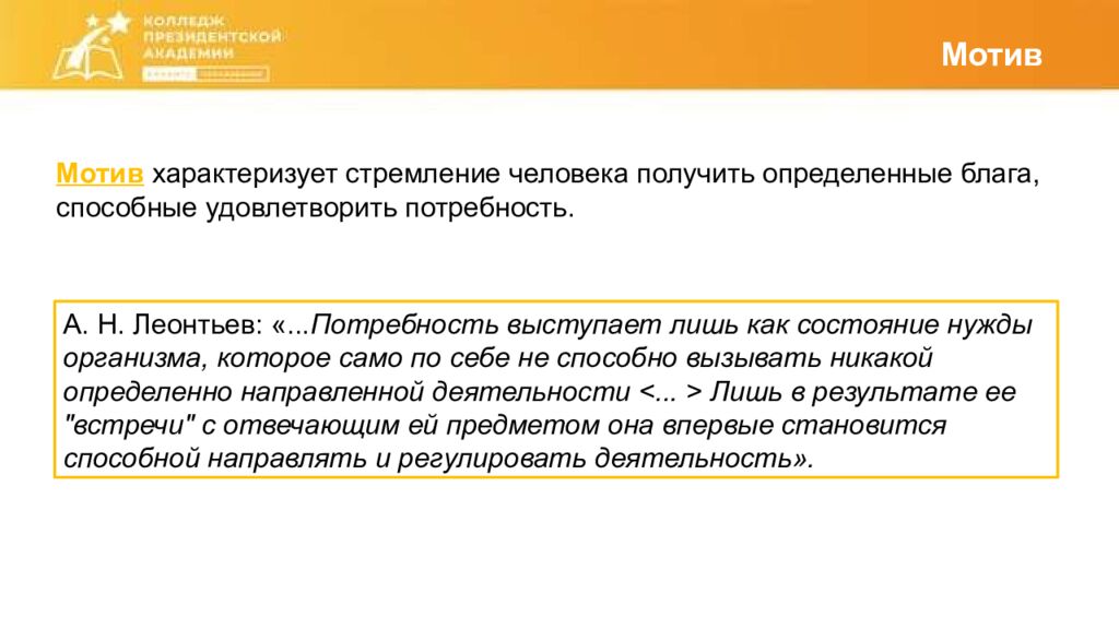 Мотив Мотив характеризует стремление человека получить определенные блага, способные удовлетворить потребность. А. Н. Леонтьев: «... Потребность выступает лишь как состояние нужды организма, которое само по себе не способно вызывать никакой определенно направленной деятельности <... > Лишь в результате ее "встречи" с отвечающим ей предметом она впервые становится способной направлять и регулировать деятельность».