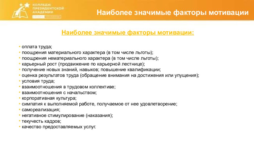 Наиболее значимые факторы мотивации Наиболее значимые факторы мотивации: оплата труда; поощрения материального характера (в том числе льготы); поощрения нематериального характера (в том числе льготы); карьерный рост (продвижение по карьерной лестнице); получение новых знаний, навыков; повышение квалификации; оценка результатов труда (обращение внимания на достижения или упущения); условия труда; взаимоотношения в трудовом коллективе; взаимоотношения с начальством; корпоративная культура; симпатия к выполняемой работе, получаемое от нее удовлетворение; самореализация; негативное стимулирование (наказания); текучесть кадров; качество предоставляемых услуг.
