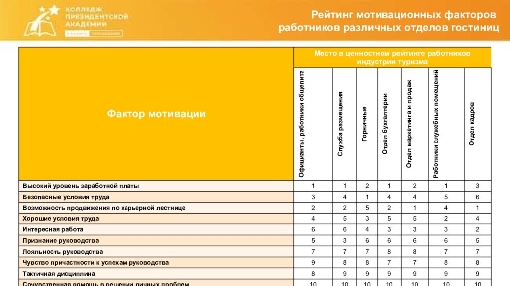 Рейтинг мотивационных факторов работников различных отделов гостиниц Фактор мотивации Место в ценностном рейтинге работников индустрии туризма Официанты, работники общепита Служба размещения Горничные Отдел бухгалтерии Отдел маркетинга и продаж Работники служебных помещений Отдел кадров Высокий уровень заработной платы 1 1 2 1 2 1 3 Безопасные условия труда 3 4 1 4 4 5 6 Возможность продвижения по карьерной лестнице 2 2 5 2 1 4 1 Хорошие условия труда 4 5 3 5 5 2 4 Интересная работа 6 6 4 3 3 3 2 Признание руководства 5 3 6 6 6 6 5 Лояльность руководства 7 7 7 8 8 7 7 Чувство причастности к успехам руководства 9 8 8 7 7 8 8 Тактичная дисциплина 8 9 9 9 9 9 9 Сочувственная помощь в решении личных проблем 10 10 10 10 10 10 10