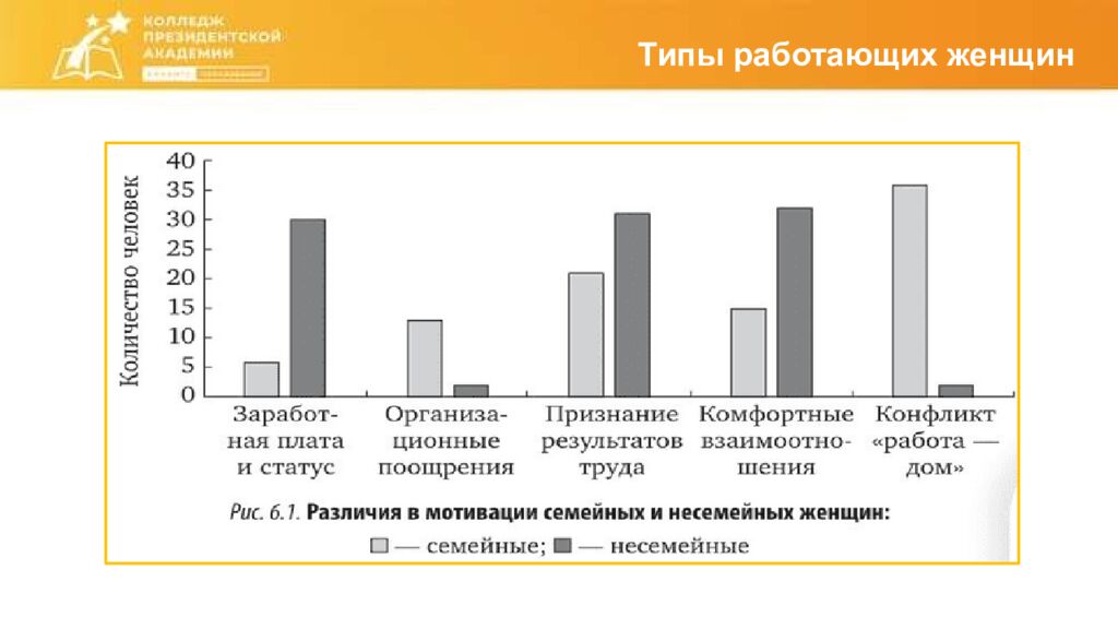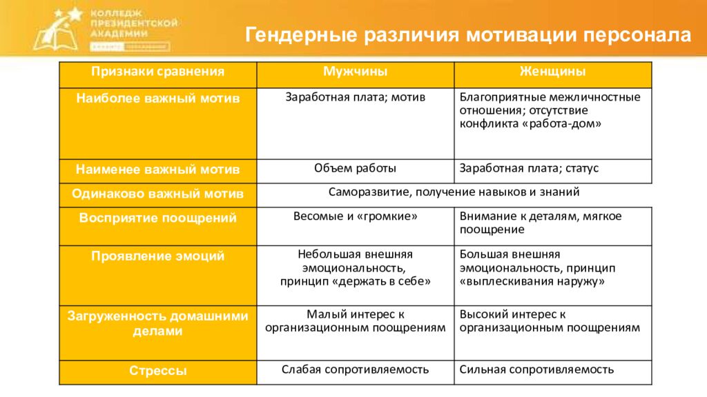 Гендерные различия мотивации персонала Признаки сравнения Мужчины Женщины Наиболее важный мотив Заработная плата ; мотив Благоприятные межличностные отношения ; отсутствие конфликта «работа-дом» Наименее важный мотив Объем работы Заработная плата ; статус Одинаково важный мотив Саморазвитие, получение навыков и знаний Восприятие поощрений Весомые и «громкие» Внимание к деталям, мягкое поощрение Проявление эмоций Небольшая внешняя эмоциональность, принцип «держать в себе » Большая внешняя эмоциональность, принцип «выплескивания наружу» Загруженность домашними делами Малый интерес к организационным поощрениям Высокий интерес к организационным поощрениям Стрессы Слабая сопротивляемость Сильная сопротивляемость