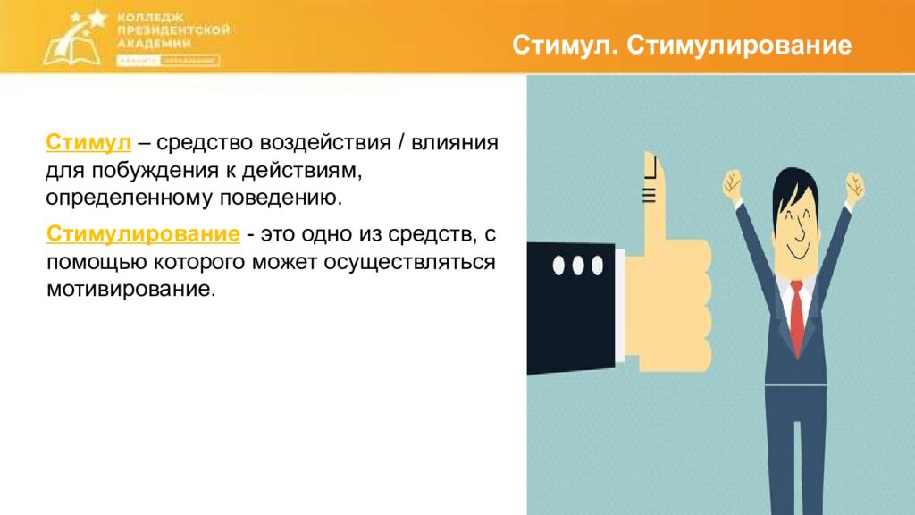 Стимул. Стимулирование Стимул – средство воздействия / влияния для побуждения к действиям, определенному поведению. Стимулирование - это одно из средств, с помощью которого может осуществляться мотивирование.