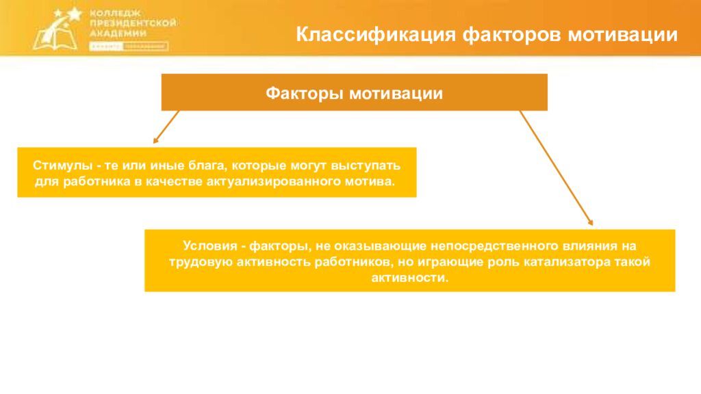 Классификация факторов мотивации Факторы мотивации Стимулы - те или иные блага, которые могут выступать для работника в качестве актуализированного мотива. Условия - факторы, не оказывающие непосредственного влияния на трудовую активность работников, но играющие роль катализатора такой активности.