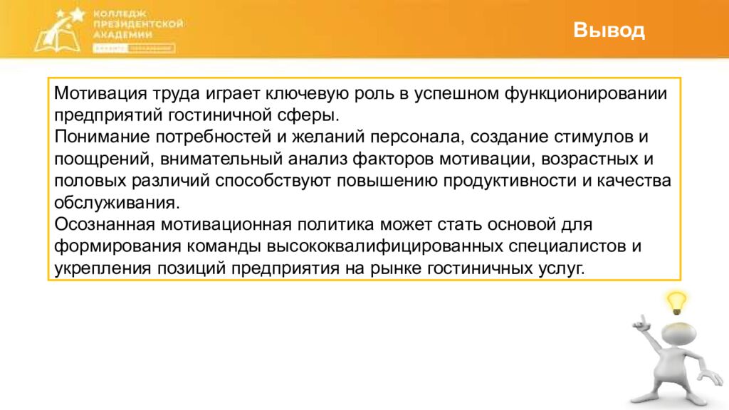 Вывод Мотивация труда играет ключевую роль в успешном функционировании предприятий гостиничной сферы. Понимание потребностей и желаний персонала, создание стимулов и поощрений, внимательный анализ факторов мотивации, возрастных и половых различий способствуют повышению продуктивности и качества обслуживания. Осознанная мотивационная политика может стать основой для формирования команды высококвалифицированных специалистов и укрепления позиций предприятия на рынке гостиничных услуг.