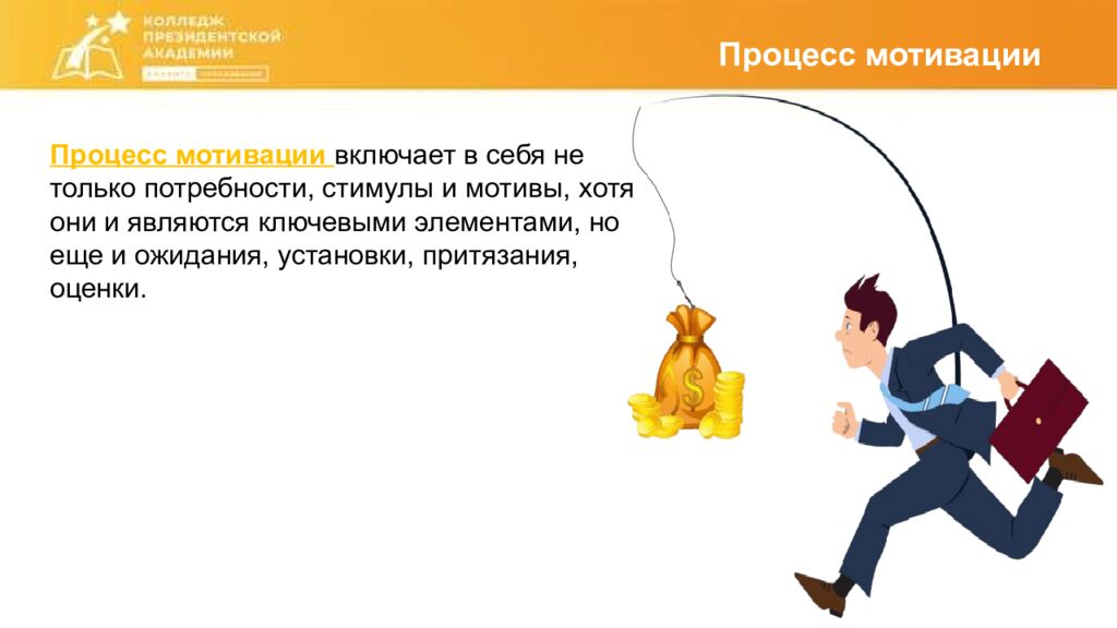 Процесс мотивации Процесс мотивации включает в себя не только потребности, стимулы и мотивы, хотя они и являются ключевыми элементами, но еще и ожидания, установки, притязания, оценки.