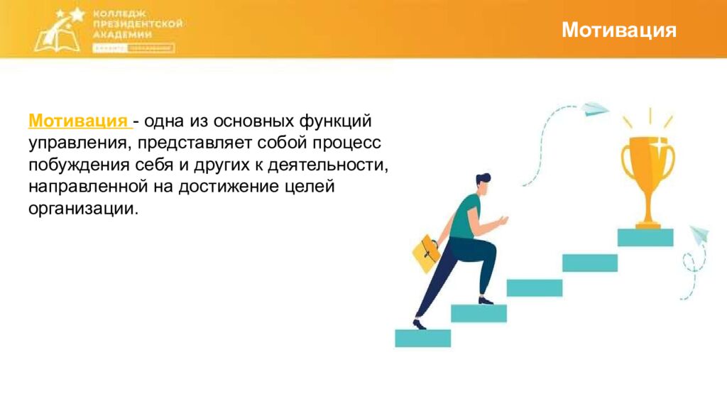 Мотивация Мотивация - одна из основных функций управления, представляет собой процесс побуждения себя и других к деятельности, направленной на достижение целей организации.