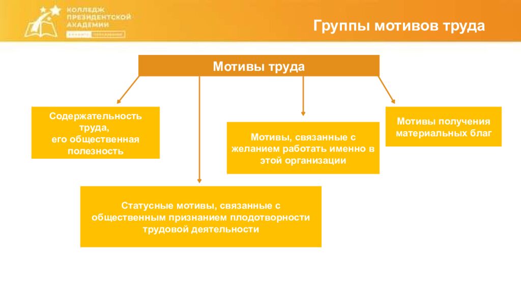 Группы мотивов труда Мотивы труда Содержательность труда, его общественная полезность Статусные мотивы, связанные с общественным признанием плодотворности трудовой деятельности Мотивы получения материальных благ Мотивы, связанные с желанием работать именно в этой организации
