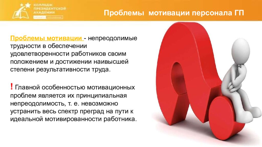 П роблемы мотивации персонала ГП Проблемы мотивации - непреодолимые трудности в обеспечении удовлетворенности работников своим положением и достижении наивысшей степени результативности труда. ! Главной особенностью мотивационных проблем является их принципиальная непреодолимость, т. е. невозможно устранить весь спектр преград на пути к идеальной мотивированности работника.