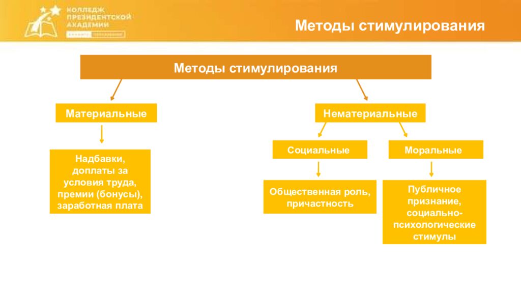 Методы стимулирования Методы стимулирования Материальные Нематериальные Надбавки, доплаты за условия труда, премии (бонусы), заработная плата Социальные Моральные Публичное признание, социально-психологические стимулы Общественная роль, причастность