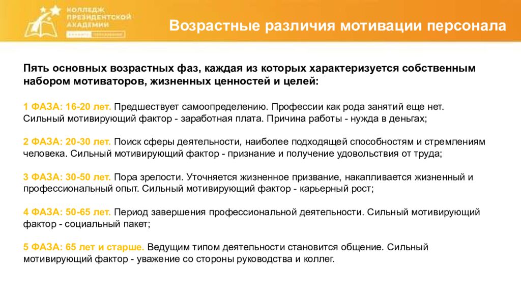 Возрастные различия мотивации персонала П ять основных возрастных фаз, каждая из которых характеризуется собственным набором мотиваторов, жизненных ценностей и целей: 1 ФАЗА : 16-20 лет. Предшествует самоопределению. Профессии как рода занятий еще нет. Сильный мотивирующий фактор - заработная плата. Причина работы - нужда в деньгах; 2 ФАЗА : 20-30 лет. Поиск сферы деятельности, наиболее подходящей способностям и стремлениям человека. Сильный мотивирующий фактор - признание и получение удовольствия от труда; 3 ФАЗА : 30-50 лет. Пора зрелости. Уточняется жизненное призвание, накапливается жизненный и профессиональный опыт. Сильный мотивирующий фактор - карьерный рост; 4 ФАЗА : 50-65 лет. Период завершения профессиональной деятельности. Сильный мотивирующий фактор - социальный пакет; 5 ФАЗА : 65 лет и старше. Ведущим типом деятельности становится общение. Сильный мотивирующий фактор - уважение со стороны руководства и коллег.