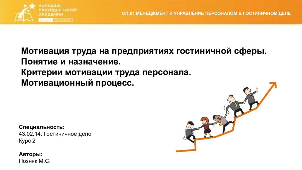 ОП.01 МЕНЕДЖМЕНТ И УПРАВЛЕНИЕ ПЕРСОНАЛОМ В ГОСТИНИЧНОМ ДЕЛЕ Мотивация труда на предприятиях гостиничной сферы. Понятие и назначение. Критерии мотивации труда персонала. Мотивационный процесс. Специальность : 43.02.14. Гостиничное дело Курс 2 Автор ы : Позняк М.С.