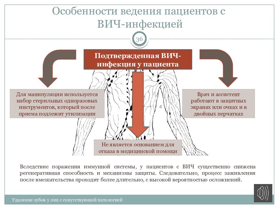 Удаление зубов у лиц с сопутствующей патологией 36 Подтвержденная ВИЧ-инфекция у пациента Не является основанием для отказа в медицинской помощи Врач и ассистент работают в защитных экранах или очках и в двойных перчатках Для манипуляции используется набор стерильных одноразовых инструментов, который после приема подлежит утилизации Вследствие поражения иммунной системы, у пациентов с ВИЧ существенно снижена регенеративная способность и механизмы защиты. Следовательно, процесс заживления после вмешательства проходит более длительно, с высокой вероятностью осложнений.