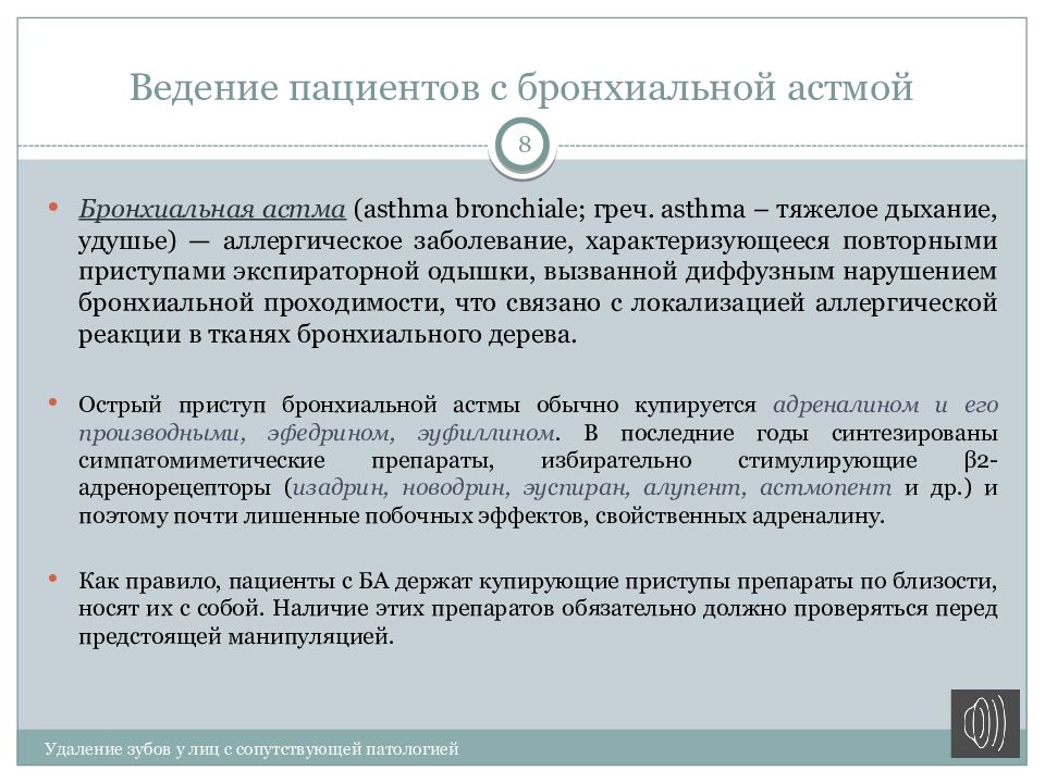 Удаление зубов у лиц с сопутствующей патологией 8 Бронхиальная астма ( asthma bronchiale ; греч. asthma – тяжелое дыхание, удушье) — аллергическое заболевание, характеризующееся повторными приступами экспираторной одышки, вызванной диффузным нарушением бронхиальной проходимости, что связано с локализацией аллергической реакции в тканях бронхиального дерева. Острый приступ бронхиальной астмы обычно купируется адреналином и его производными, эфедрином, эуфиллином. В последние годы синтезированы симпатомиметические препараты, избирательно стимулирующие β2-адренорецепторы ( изадрин, новодрин, эуспиран, алупент, астмопент и др.) и поэтому почти лишенные побочных эффектов, свойственных адреналину. Как правило, пациенты с БА держат купирующие приступы препараты по близости, носят их с собой. Наличие этих препаратов обязательно должно проверяться перед предстоящей манипуляцией.