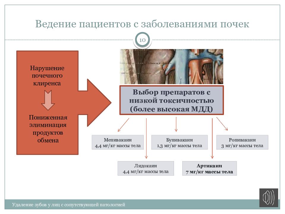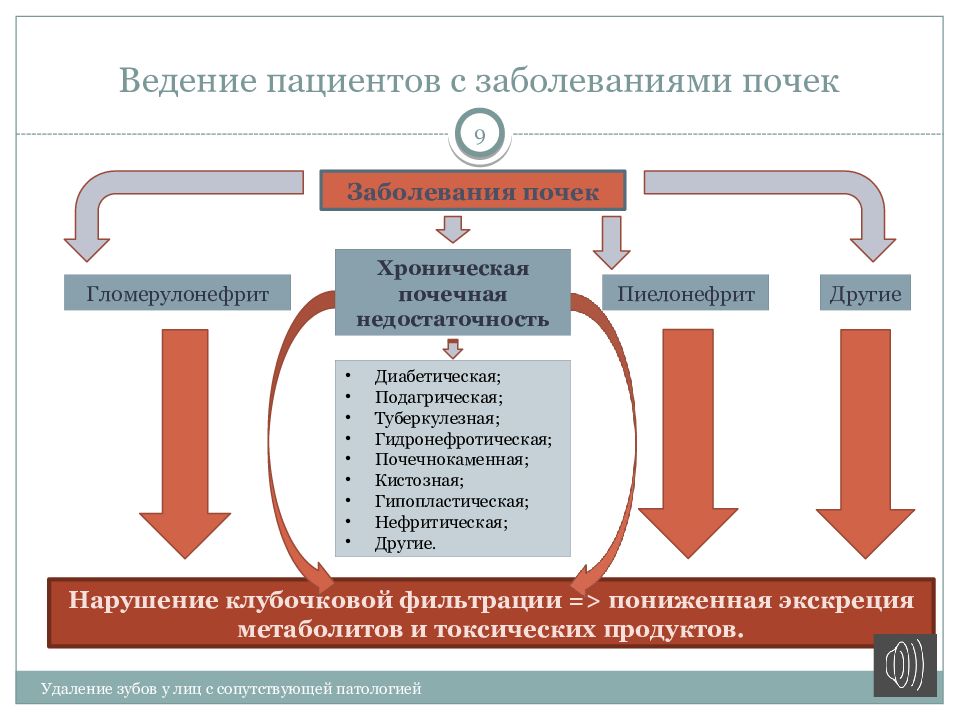 Удаление зубов у лиц с сопутствующей патологией 9 Заболевания почек Гломерулонефрит Пиелонефрит Другие Диабетическая; Подагрическая; Туберкулезная; Гидронефротическая ; Почечнокаменная; Кистозная; Гипопластическая; Нефритическая; Другие. Нарушение клубочковой фильтрации = > пониженная экскреция метаболитов и токсических продуктов. Хроническая почечная недостаточность