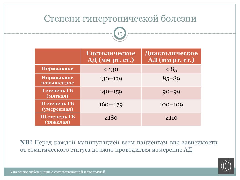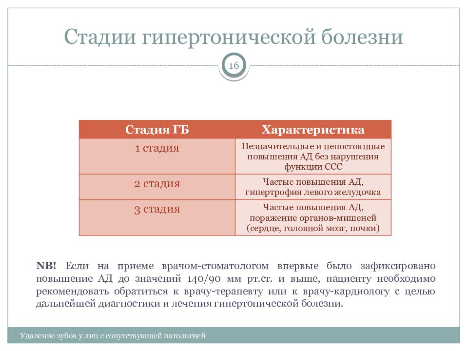 Удаление зубов у лиц с сопутствующей патологией 15 Систолическое АД (мм рт. ст.) Диастолическое АД (мм рт. ст.) Нормальное < 130 < 85 Нормальное повышенное 130–139 85–89 I степень ГБ (мягкая) 140–159 90–99 II степень ГБ (умеренная) 160—179 100– 109 III степень ГБ (тяжелая) ≥180 ≥110 NB! Перед каждой манипуляцией всем пациентам вне зависимости от соматического статуса должно проводиться измерение АД.