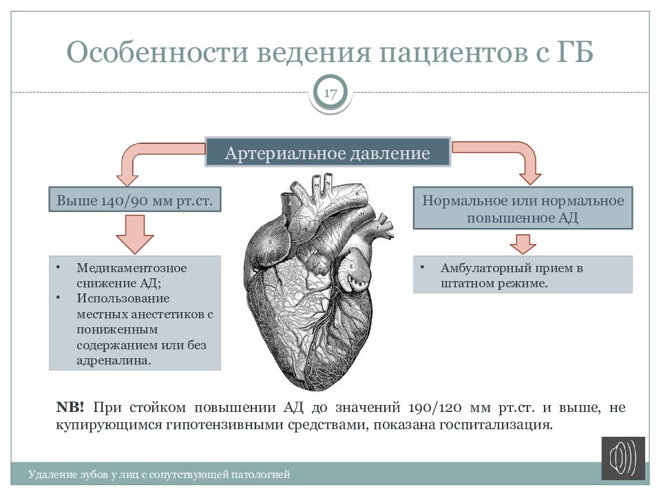 Удаление зубов у лиц с сопутствующей патологией 16 Стадия ГБ Характеристика 1 стадия Незначительные и непостоянные повышения АД без нарушения функции ССС 2 стадия Частые повышения АД, гипертрофия левого желудочка 3 стадия Частые повышения АД, поражение органов-мишеней (сердце, головной мозг, почки) NB ! Если на приеме врачом-стоматологом впервые было зафиксировано повышение АД до значений 140/90 мм рт.ст. и выше, пациенту необходимо рекомендовать обратиться к врачу-терапевту или к врачу-кардиологу с целью дальнейшей диагностики и лечения гипертонической болезни.
