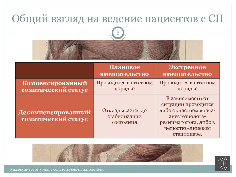 Удаление зубов у лиц с сопутствующей патологией 6 Плановое вмешательство Экстренное вмешательство Компенсированный соматический статус Проводится в штатном порядке Проводится в штатном порядке Декомпенсированный соматический статус Откладывается до стабилизации состояния В зависимости от ситуации проводится либо с участием врача-анестезиолога-реаниматолога, либо в челюстно-лицевом стационаре.