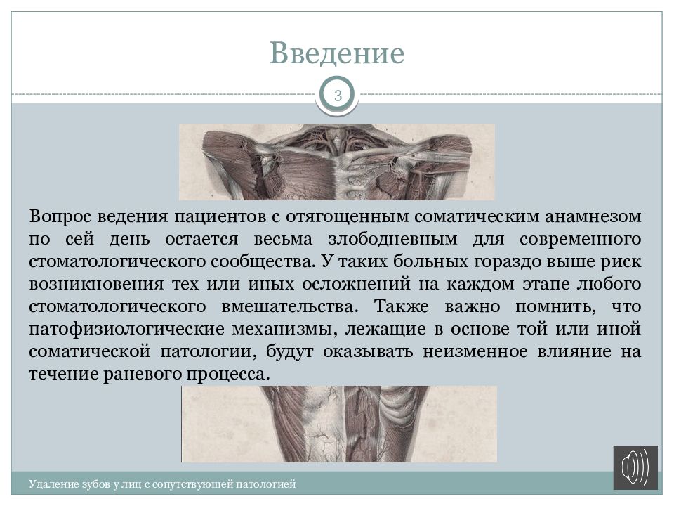 Вопрос ведения пациентов с отягощенным соматическим анамнезом по сей день остается весьма злободневным для современного стоматологического сообщества. У таких больных гораздо выше риск возникновения тех или иных осложнений на каждом этапе любого стоматологического вмешательства. Также важно помнить, что патофизиологические механизмы, лежащие в основе той или иной соматической патологии, будут оказывать неизменное влияние на течение раневого процесса. Удаление зубов у лиц с сопутствующей патологией 3