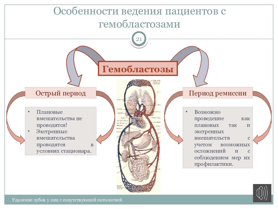 Удаление зубов у лиц с сопутствующей патологией 21 Острый период Плановые вмешательства не проводятся! Экстренные вмешательства проводятся в условиях стационара. Возможно проведение как плановых так и экстренных вмешательств с учетом возможных осложнений и с соблюдением мер их профилактики. Гемобластозы Период ремиссии