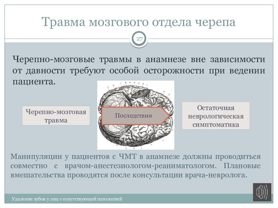 Удаление зубов у лиц с сопутствующей патологией 27 Черепно-мозговые травмы в анамнезе вне зависимости от давности требуют особой осторожности при ведении пациента. Черепно-мозговая травма Остаточная неврологическая симптоматика Последствия Манипуляции у пациентов с ЧМТ в анамнезе должны проводиться совместно с врачом-анестезиологом-реаниматологом. Плановые вмешательства проводятся после консультации врача-невролога.