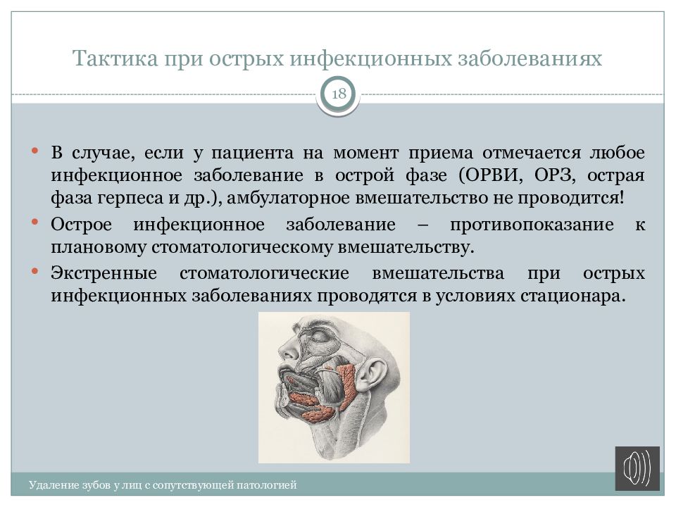 Удаление зубов у лиц с сопутствующей патологией 18 В случае, если у пациента на момент приема отмечается любое инфекционное заболевание в острой фазе (ОРВИ, ОРЗ, острая фаза герпеса и др.), амбулаторное вмешательство не проводится! Острое инфекционное заболевание – противопоказание к плановому стоматологическому вмешательству. Экстренные стоматологические вмешательства при острых инфекционных заболеваниях проводятся в условиях стационара.