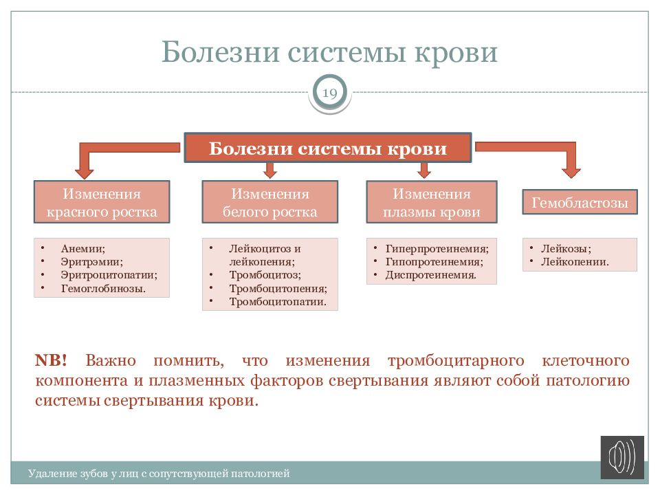 Удаление зубов у лиц с сопутствующей патологией 19 Изменения красного ростка Изменения белого ростка Изменения плазмы крови Гемобластозы Анемии; Эритрэмии ; Эритроцитопатии ; Гемоглобинозы. Лейкоцитоз и лейкопения; Тромбоцитоз; Тромбоцитопения; Тромбоцитопатии. Гиперпротеинемия ; Гипопротеинемия ; Диспротеинемия. Лейкозы; Лейкопении. NB! Важно помнить, что изменения тромбоцитарного клеточного компонента и плазменных факторов свертывания являют собой патологию системы свертывания крови. Болезни системы крови