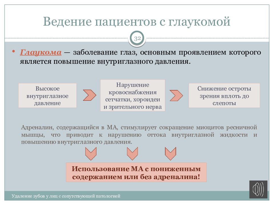 Удаление зубов у лиц с сопутствующей патологией 32 Глаукома — заболевание глаз, основным проявлением которого является повышение внутриглазного давления. Высокое внутриглазное давление Нарушение кровоснабжения сетчатки, хороидеи и зрительного нерва Снижение остроты зрения вплоть до слепоты Адреналин, содержащийся в МА, стимулирует сокращение миоцитов ресничной мышцы, что приводит к наруш е нию оттока внутриглазной жидкости и повышению внутриглазного давления. Использование МА с пониженным содержанием или без адреналина!