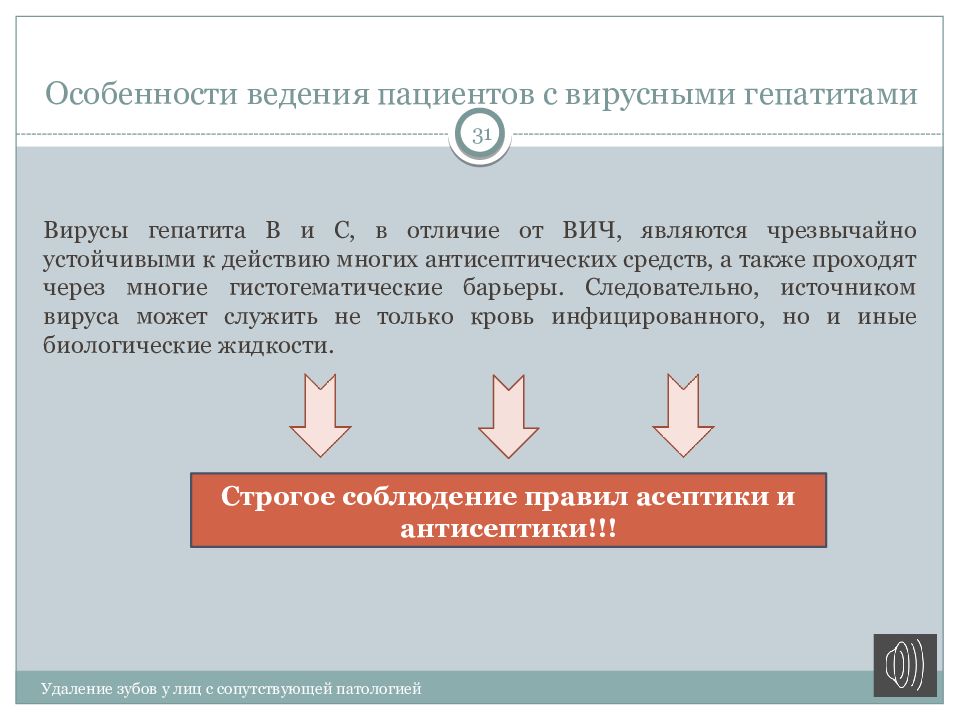 Удаление зубов у лиц с сопутствующей патологией 31 Вирус ы гепатита B и C, в отличие от ВИЧ, являются чрезвычайно устойчивыми к действию многих антисептических средств, а также проходят через многие гистогематические барьеры. Следовательно, источником вируса может служить не только кровь инфицированного, но и иные биологические жидкости. Строгое соблюдение правил асептики и антисептики!!!