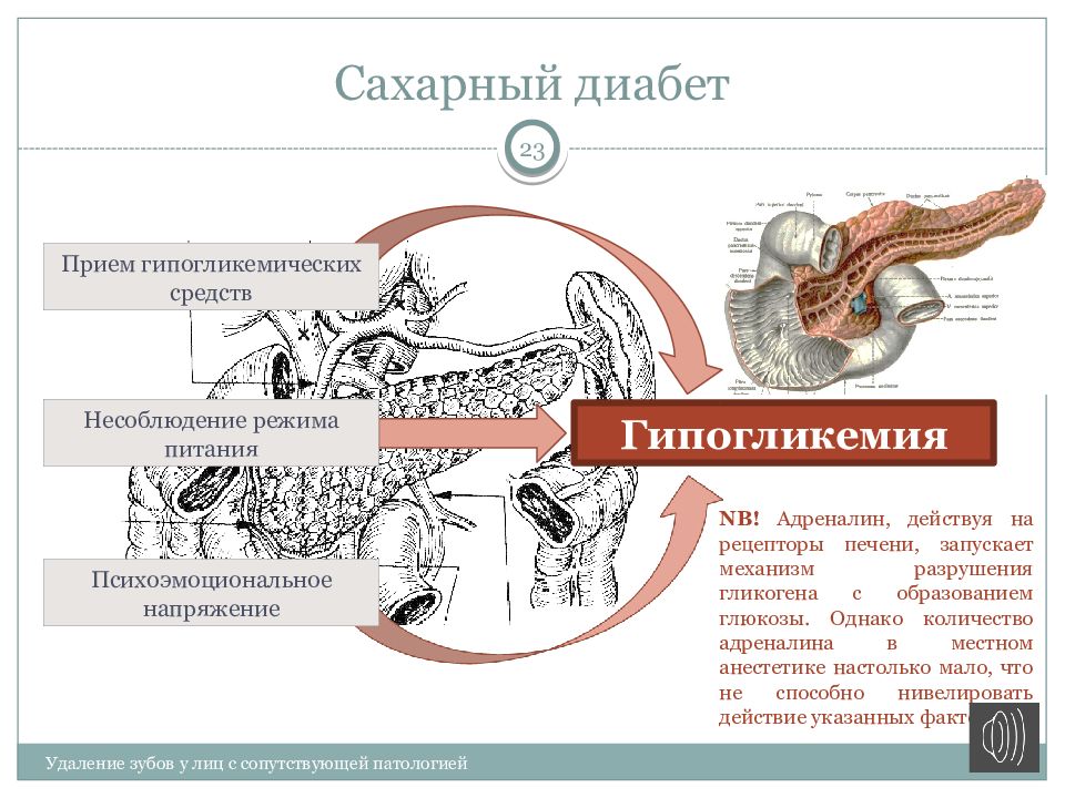Удаление зубов у лиц с сопутствующей патологией 23 Гипогликемия Прием гипогликемических средств Психоэмоциональное напряжение Несоблюдение режима питания NB! Адреналин, действуя на рецепторы печени, запускает механизм разрушения гликогена с образованием глюкозы. Однако количество адреналина в местном анестетике настолько мало, что не способно нивелировать действие указанных факторов.