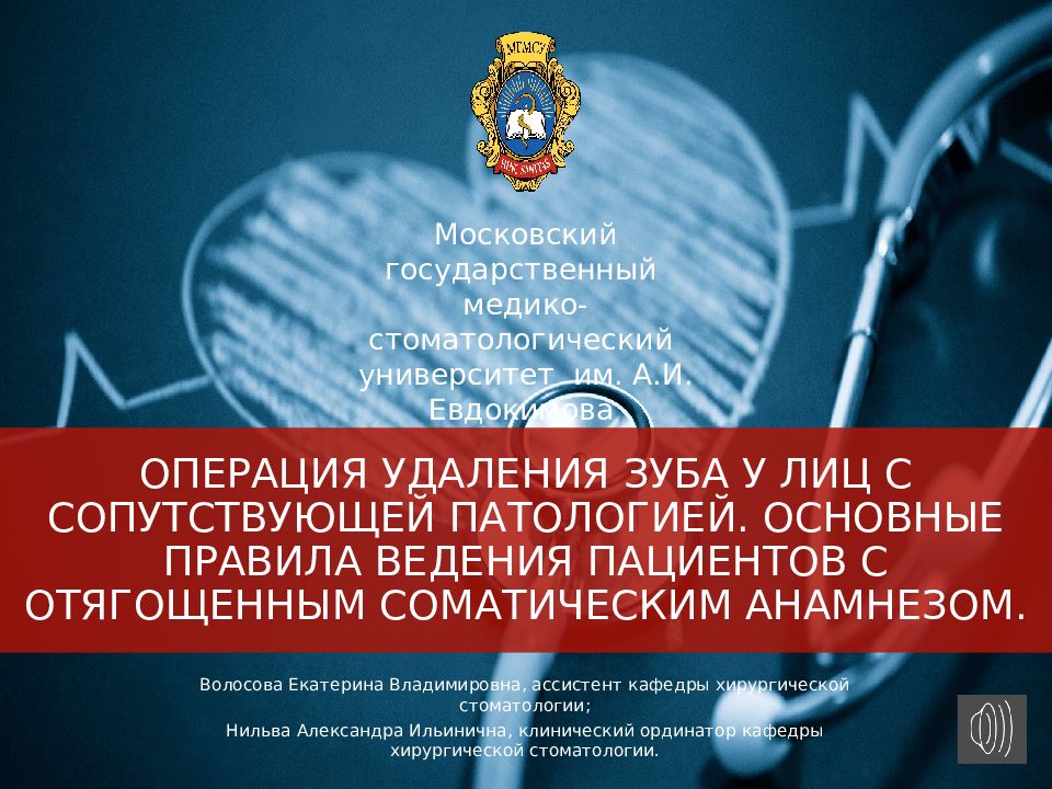 Первый слайд презентации: Операция удаления зуба у лиц с сопутствующей патологией. Основные правила ведения пациентов с отягощенным соматическим анамнезом
