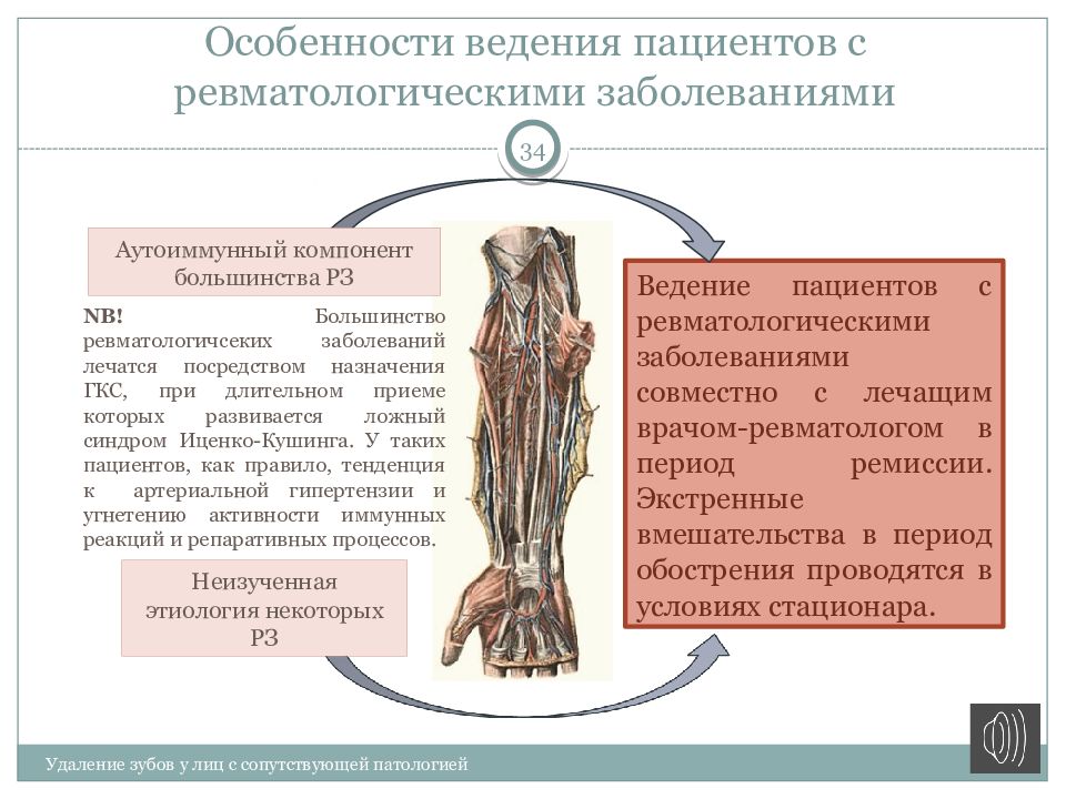 Удаление зубов у лиц с сопутствующей патологией 33 Ревматоидный артрит Системные поражения соединительной ткани Ювенильный артрит Другие Микрокристаллические артриты Остеоартрит и близкие болезни Артриты, связанные с инфекцией Системные васкулиты Ревматологические заболевания Острая ревматическая лихорадка и хроническая ревматическая болезнь сердца