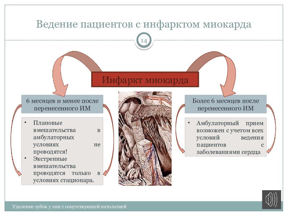 Удаление зубов у лиц с сопутствующей патологией 13 Участие врача-анестезиолога-реаниматолога Использование местноанестезирующих средств с пониженным содержанием или без адреналина Плановые вмешательства проводятся с предварительной консультацией врача-кардиолога Если пациент принимает препарат « Кардиомагнил » (Ацетилсалициловая к-та + Магния гидроксид), то за 24 ч до манипуляции его следует отменить Общие аспекты ведения пациентов с заболеваниями сердца