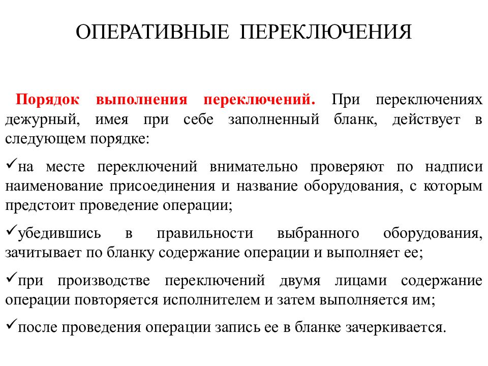 Порядок выполнения переключений. При переключениях дежурный, имея при себе заполненный бланк, действует в следующем порядке: на месте переключений внимательно проверяют по надписи наименование присоединения и название оборудования, с которым предстоит проведение операции; убедившись в правильности выбранного оборудования, зачитывает по бланку содержание операции и выполняет ее; при производстве переключений двумя лицами содержание операции повторяется исполнителем и затем выполняется им; после проведения операции запись ее в бланке зачеркивается.