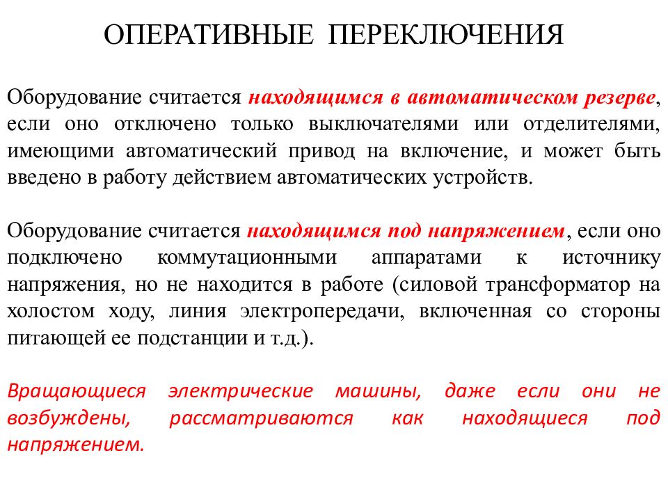 Оборудование считается находящимся в автоматическом резерве, если оно отключено только выключателями или отделителями, имеющими автоматический привод на включение, и может быть введено в работу действием автоматических устройств. Оборудование считается находящимся под напряжением, если оно подключено коммутационными аппаратами к источнику напряжения, но не находится в работе (силовой трансформатор на холостом ходу, линия электропередачи, включенная со стороны питающей ее подстанции и т.д.). Вращающиеся электрические машины, даже если они не возбуждены, рассматриваются как находящиеся под напряжением. .