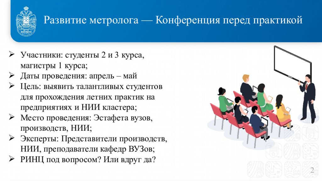 2 Развитие метролога — Конференция перед практикой Участники: студенты 2 и 3 курса, магистры 1 курса; Даты проведения: апрель – май Цель: выявить талантливых студентов для прохождения летних практик на предприятиях и НИИ кластера; Место проведения: Эстафета вузов, производств, НИИ; Эксперты: Представители производств, НИИ, преподаватели кафедр ВУЗов; РИНЦ под вопросом ? Или вдруг да ?