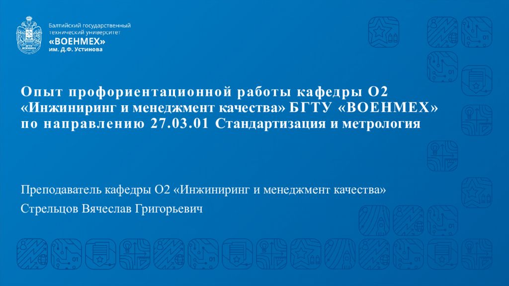 Первый слайд презентации: Опыт профориентационной работы кафедры О2 «Инжиниринг и менеджмент качества» БГТУ «ВОЕНМЕХ» по направлению 27.03.01 Стандартизация и метрология