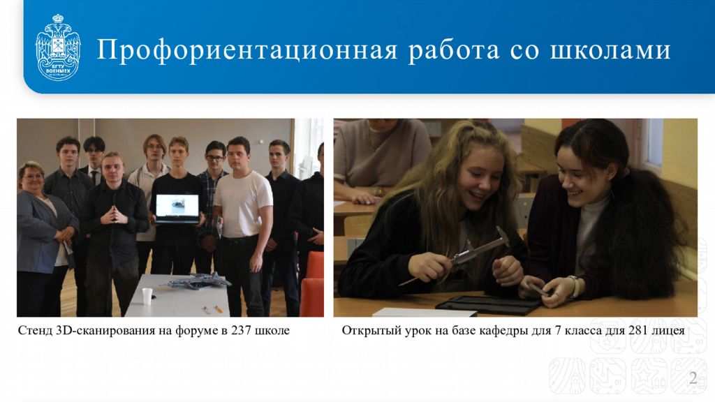 2 Профориентационная работа со школами Открытый урок на базе кафедры для 7 класса для 281 лицея Стенд 3 D- сканирования на форуме в 237 школе