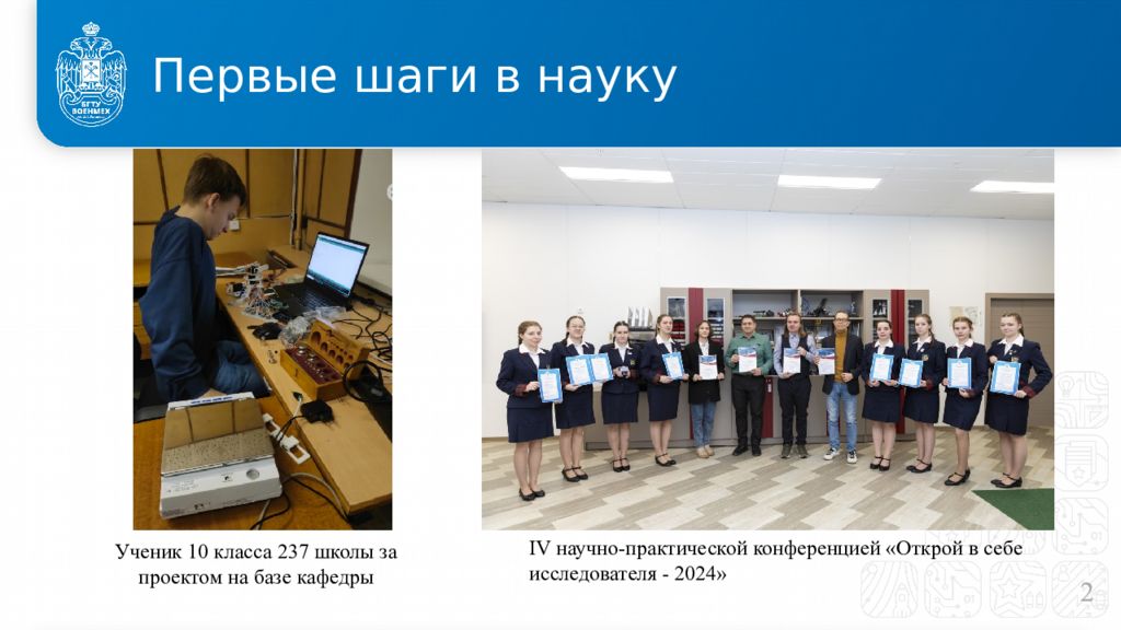 2 Первые шаги в науку IV научно-практической конференцией «Открой в себе исследователя - 2024» Ученик 10 класса 237 школы за проектом на базе кафедры