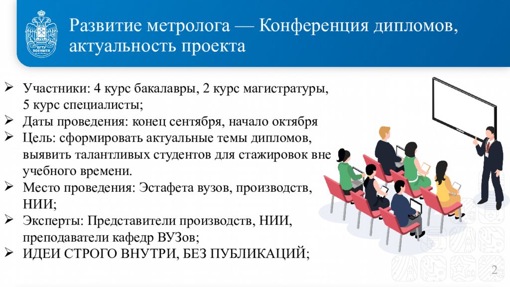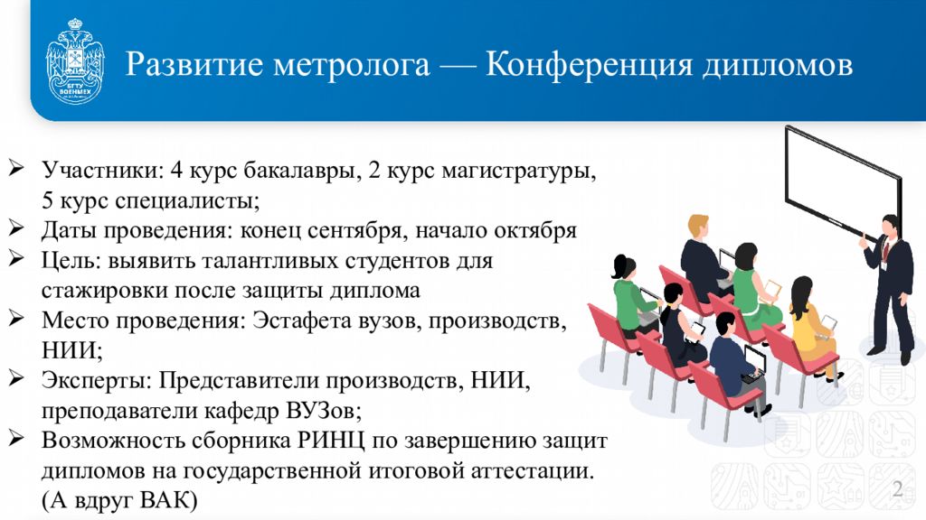 2 Развитие метролога — Конференция дипломов Участники: 4 курс бакалавры, 2 курс магистратуры, 5 курс специалисты; Даты проведения: конец сентября, начало октября Цель: выявить талантливых студентов для стажировки после защиты диплома Место проведения: Эстафета вузов, производств, НИИ; Эксперты: Представители производств, НИИ, преподаватели кафедр ВУЗов; Возможность сборника РИНЦ по завершению защит дипломов на государственной итоговой аттестации. (А вдруг ВАК)