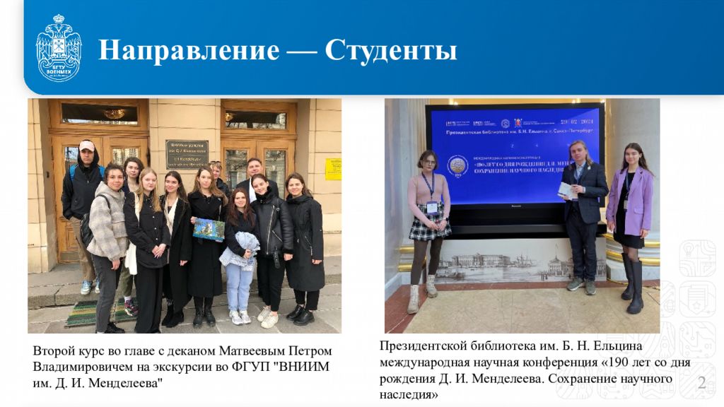 2 Направление — Студенты Второй курс во главе с деканом Матвеевым Петром Владимировичем на экскурсии во ФГУП "ВНИИМ им. Д. И. Менделеева" Президентской библиотека им. Б. Н. Ельцина международная научная конференция «190 лет со дня рождения Д. И. Менделеева. Сохранение научного наследия»