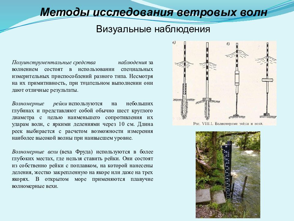Полуинструментальные средства наблюдения за волнением состоят в использовании специальных измерительных приспособлений разного типа. Несмотря на их примитивность, при тщательном выполнении они дают отличные результаты. Волномерные рейки используются на небольших глубинах и представляют собой обычно шест круглого диаметра с целью наименьшего сопротивления их ударам волн, с яркими делениями через 10 см. Длина реек выбирается с расчетом возможности измерения наиболее высокой волны при наивысшем уровне. Волномерные вехи ( веха Фруда ) используются в более глубоких местах, где нельзя ставить рейки. Они состоят из собственно рейки с поплавком, на которой нанесены деления, жестко закрепленную на якоре или даже на трех якорях. В открытом море применяются плавучие волномерные вехи. Визуальные наблюдения
