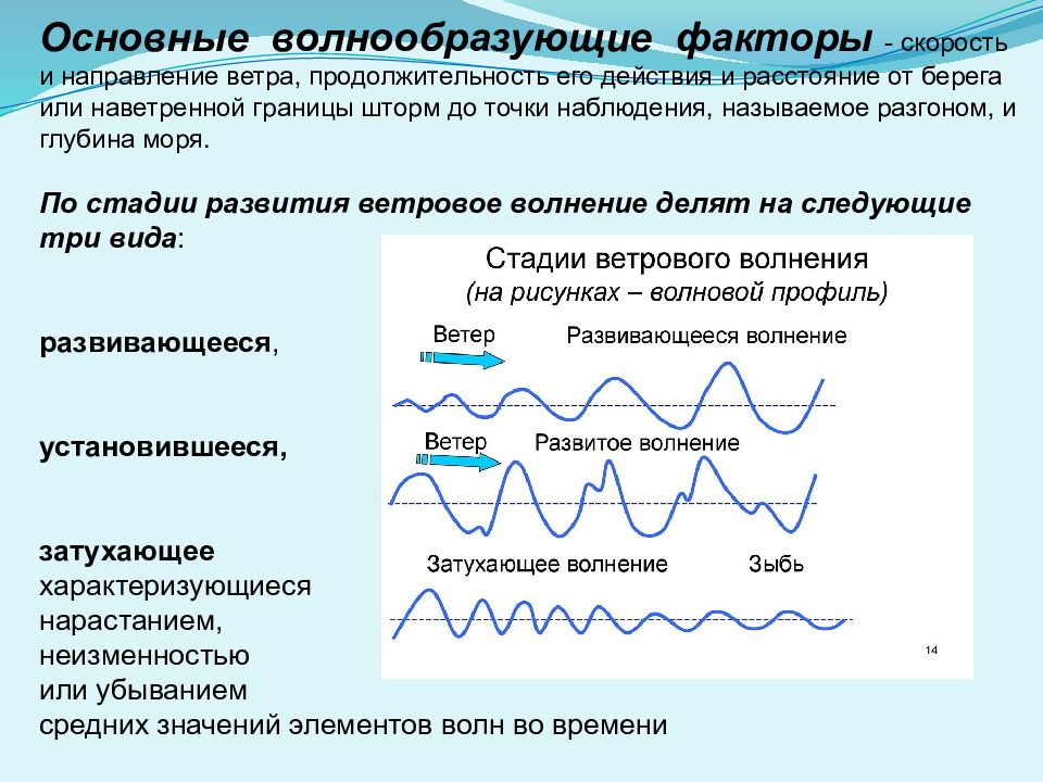 Основные волнообразующие факторы - скорость и направление ветра, продолжительность его действия и расстояние от берега или наветренной границы шторм до точки наблюдения, называемое разгоном, и глубина моря. По стадии развития ветровое волнение делят на следующие три вида : развивающееся, установившееся, затухающее характеризующиеся нарастанием, неизменностью или убыванием средних значений элементов волн во времени
