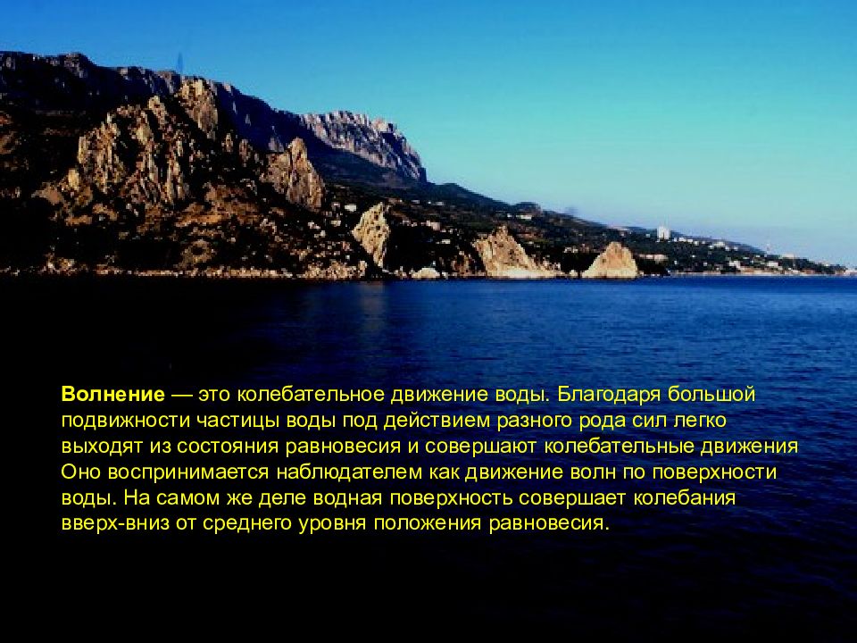 Волнение — это колебательное движение воды. Благодаря большой подвижности частицы воды под действием разного рода сил легко выходят из состояния равновесия и совершают колебательные движения Оно воспринимается наблюдателем как движение волн по поверхности воды. На самом же деле водная поверхность совершает колебания вверх-вниз от среднего уровня положения равновесия.
