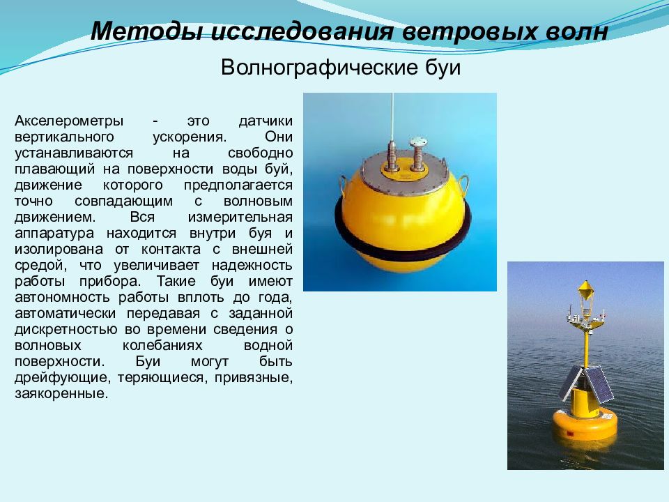 Акселерометры - это датчики вертикального ускорения. Они устанавливаются на свободно плавающий на поверхности воды буй, движение которого предполагается точно совпадающим с волновым движением. Вся измерительная аппаратура находится внутри буя и изолирована от контакта с внешней средой, что увеличивает надежность работы прибора. Такие буи имеют автономность работы вплоть до года, автоматически передавая с заданной дискретностью во времени сведения о волновых колебаниях водной поверхности. Буи могут быть дрейфующие, теряющиеся, привязные, заякоренные. Волнографические буи