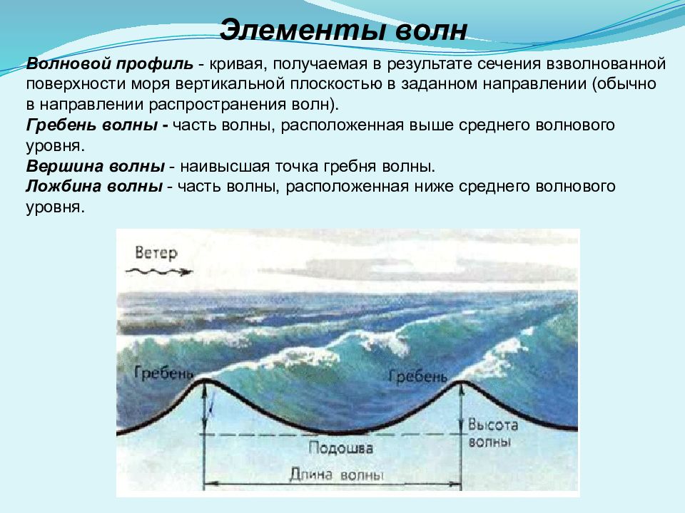 Волновой профиль - кривая, получаемая в результате сечения взволнованной поверхности моря вертикальной плоскостью в заданном направлении (обычно в направлении распространения волн). Гребень волны - часть волны, расположенная выше среднего волнового уровня. Вершина волны - наивысшая точка гребня волны. Ложбина волны - часть волны, расположенная ниже среднего волнового уровня.