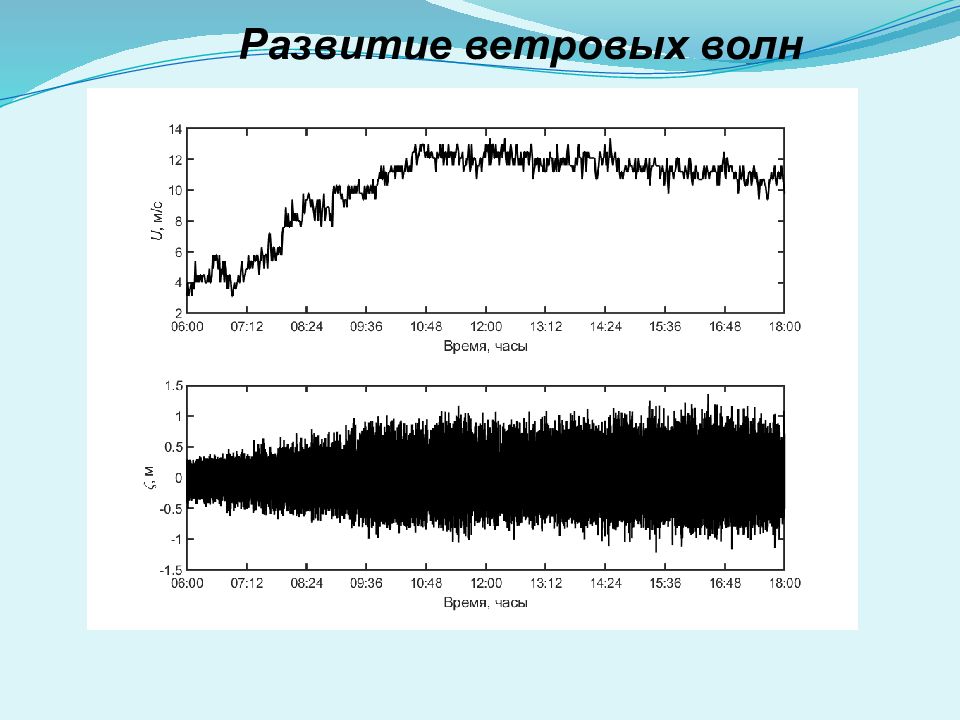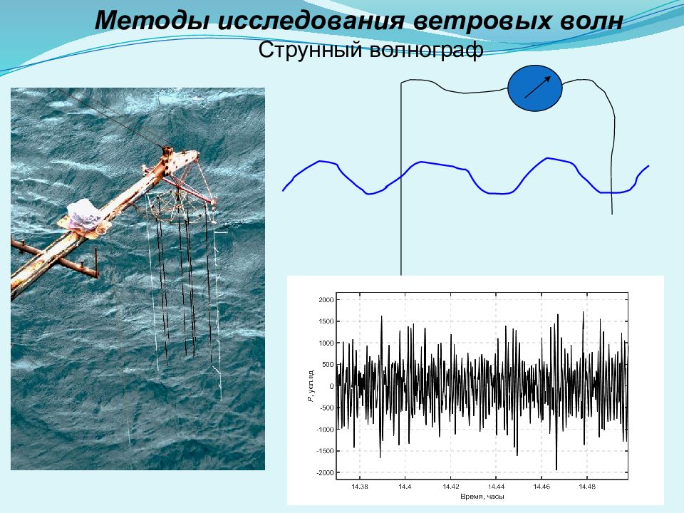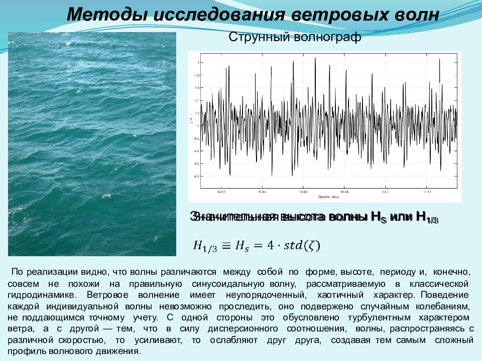 Значительная высота волны H S или H 1/3 По реализации видно, что волны различаются между собой по форме, высоте, периоду и, конечно, совсем не похожи на правильную синусоидальную волну, рассматриваемую в классической гидродинамике. Ветровое волнение имеет неупорядоченный, хаотичный характер. Поведение каждой индивидуальной волны невозможно проследить, оно подвержено случайным колебаниям, не поддающимся точному учету. С одной стороны это обусловлено турбулентным характером ветра, а с другой — тем, что в силу дисперсионного соотношения, волны, распространяясь с различной скоростью, то усиливают, то ослабляют друг друга, создавая тем самым сложный профиль волнового движения. Методы исследования ветровых волн Струнный волнограф