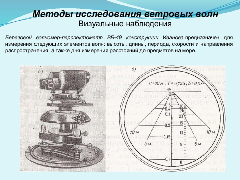 Визуальные наблюдения Береговой волномер- перспектометр ВБ-49 конструкции Иванова предназначен для измерения следующих элементов волн: высоты, длины, периода, скорости и направления распространения, а также дня измерения расстояний до предметов на море.
